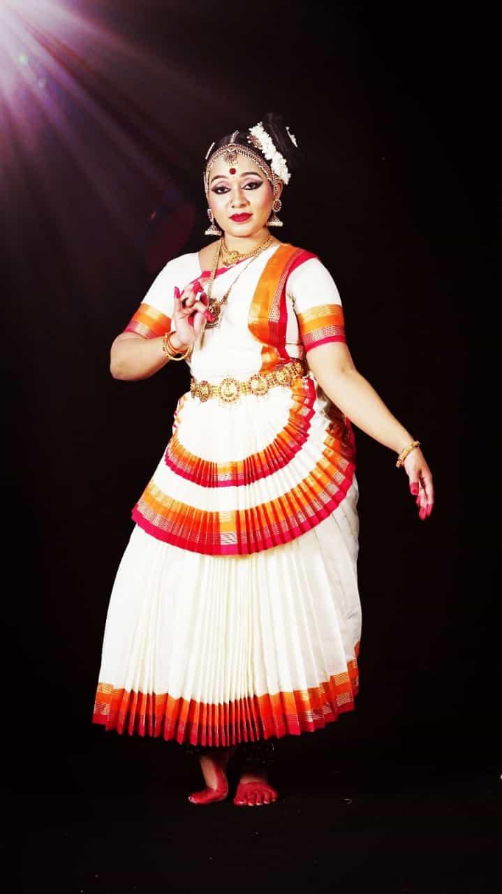Mohiniyattam is a classical Indian dance form from Kerala, known for its graceful, flowing movements, feminine emphasis, gentle swaying of the body/hips, soft footwork, expressive gestures (mudras) and facial expressions. Its aesthetic is one of Lasya (beauty, grace) rather than vigorous movement, subtlety, elegance, controlled posture, fluidity are key.